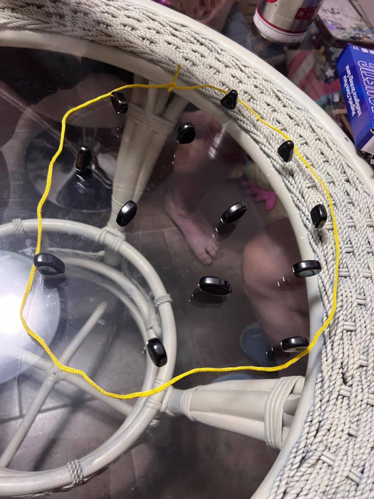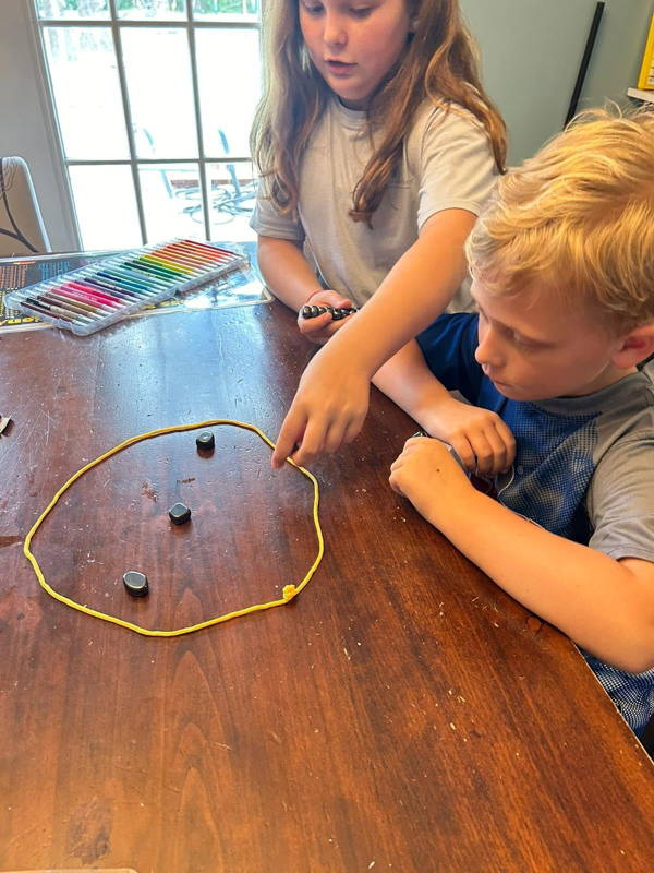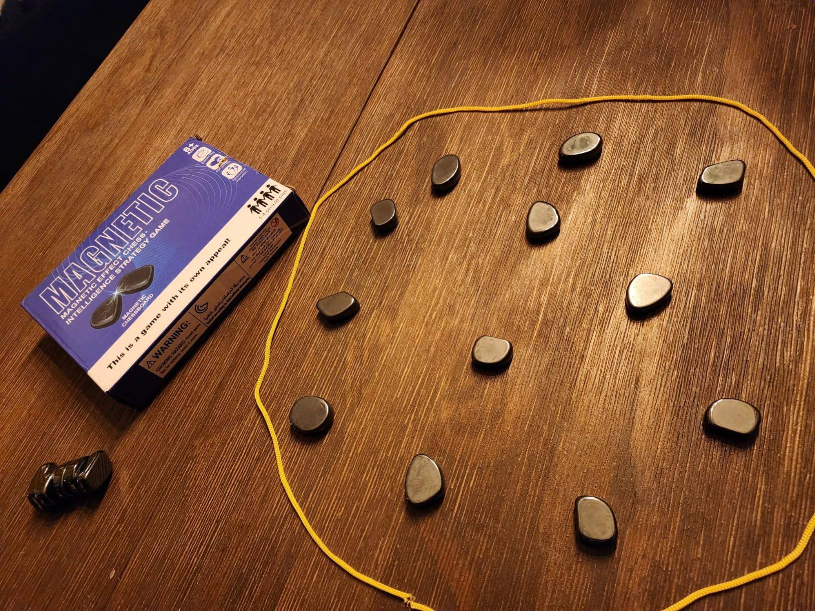 1️⃣ Așază frânghia pe masă și împarte magneții între jucători.
